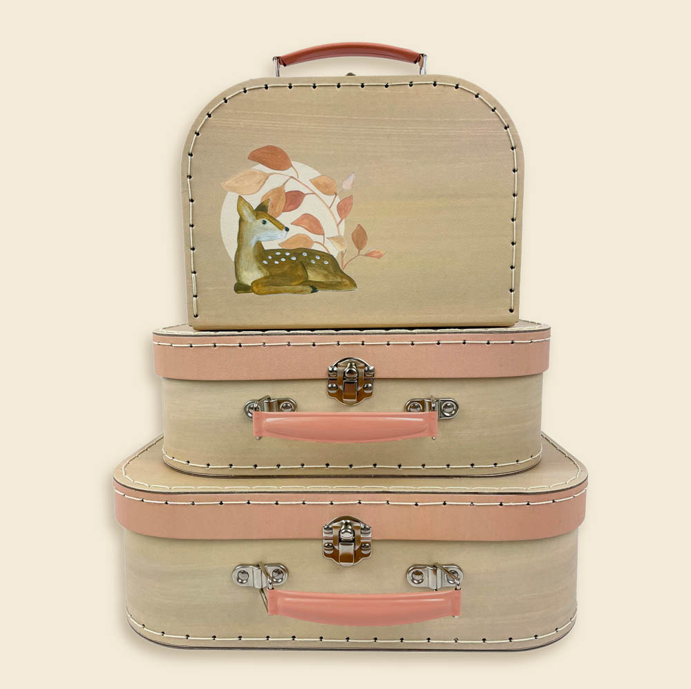 Каждый чемоданчик украшен нежным рисунком с олененком и лесными мотивами, что создает уютную, сказочную атмосферу в детской. Прочный картон и аккуратные металлические застежки выдерживают активные детские игры, а легкий вес позволяет ребенку самостоятельно переносить чемоданчики.