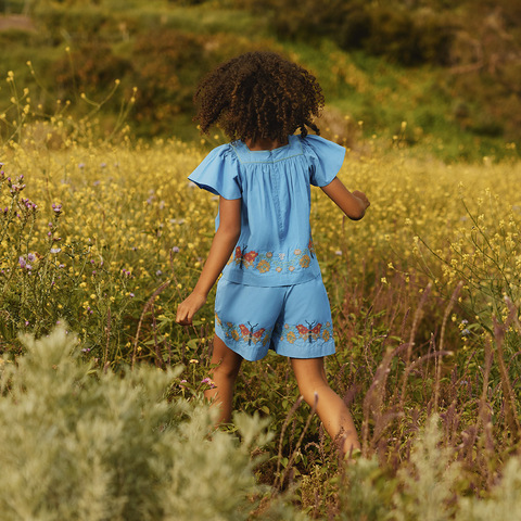 Элегантные шорты Molo в нежном голубом цвете. Украшены вышивкой крестиком. Пояс частично на резинке (по спинке). Сочетайте с блузкой для полного комплекта.