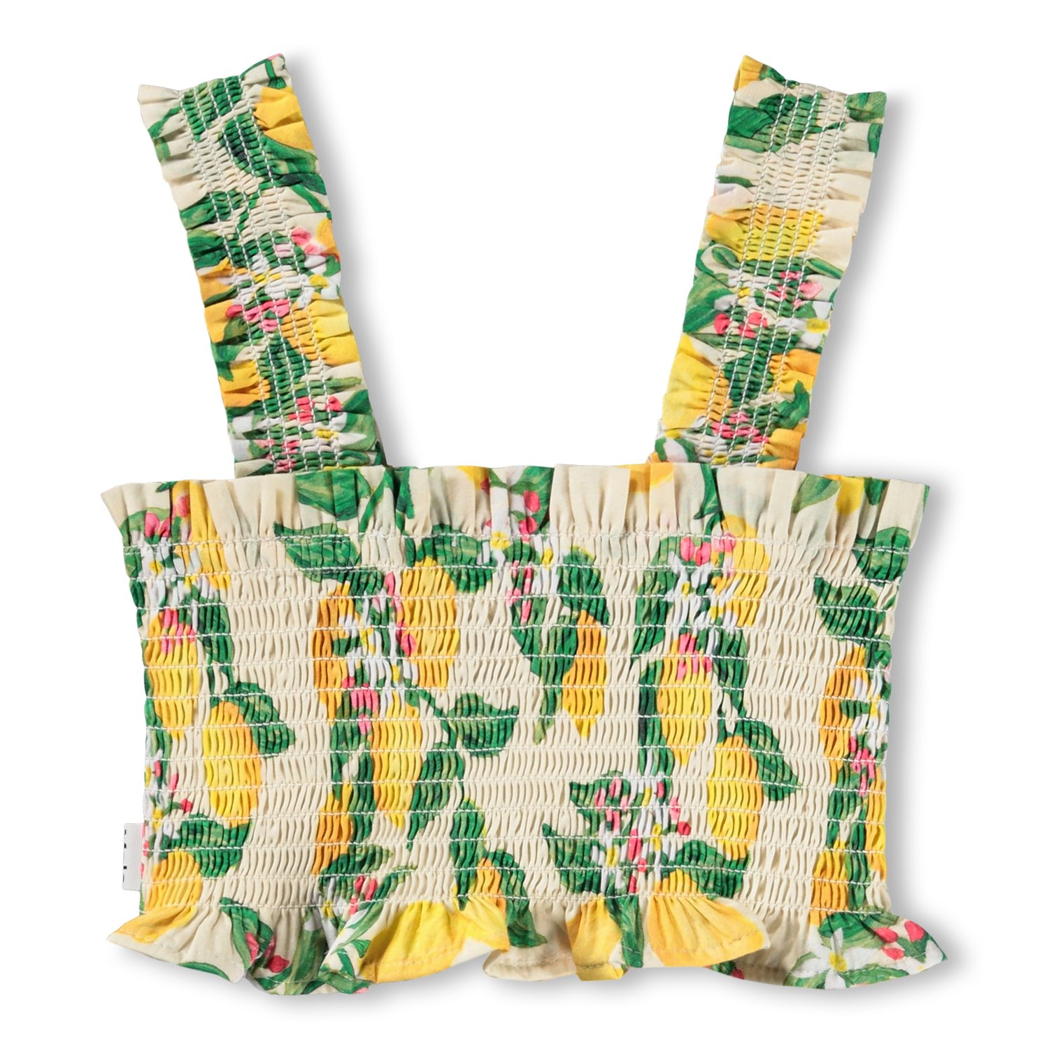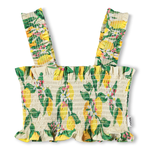 Чудесная короткая блузка Molo со стяжкой и с лимонным принтом. Невероятно удобная, на широких лямочках из нежного хлопка. Сочетайте с брюками Molo из новой коллекции.