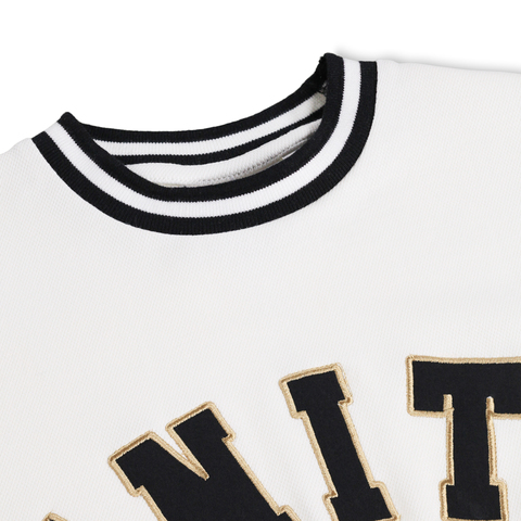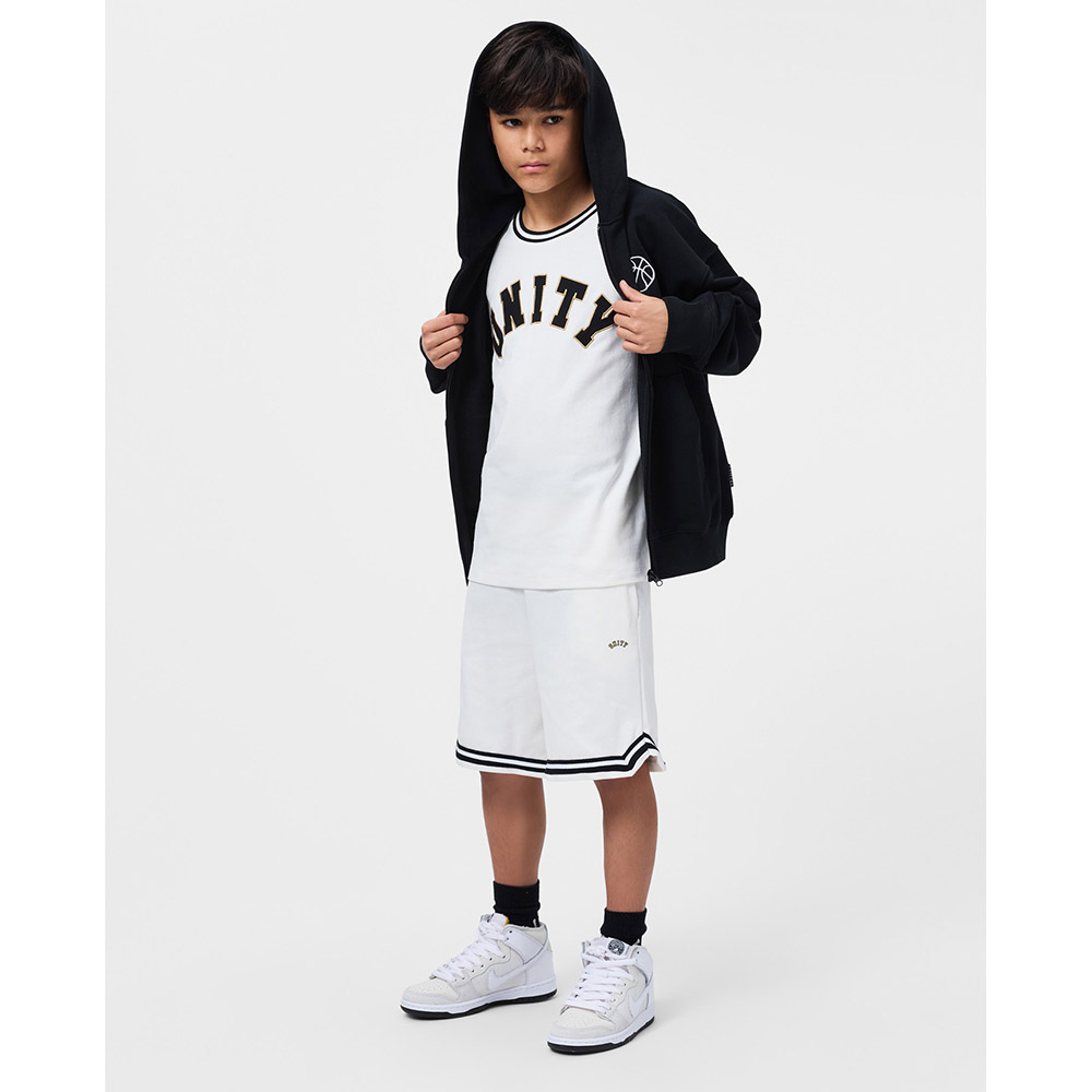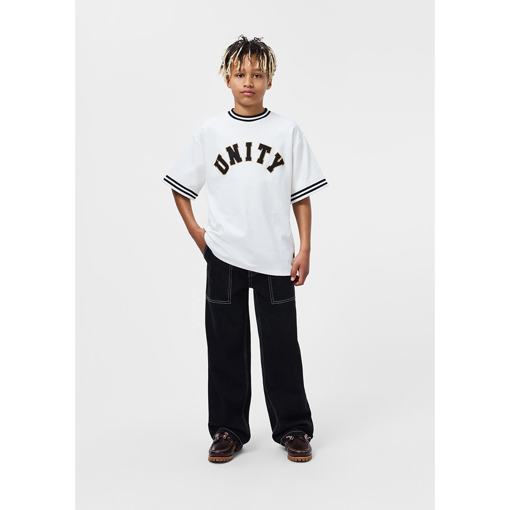 Хлопковая, светлая футболка MOLO в спортивном стиле с полосками на горловине и рукавах. Аппликация Unity на груди.