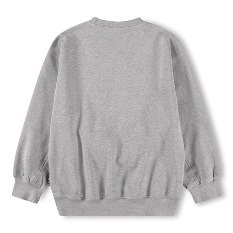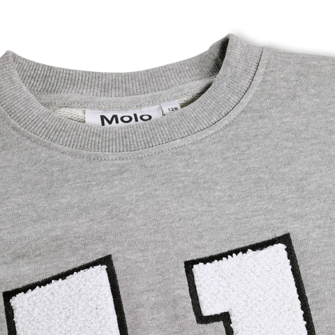 Хлопковый свитшот Molo серого цвета с аппликацией в виде смайлика с цифрой 11 на груди. Мягкие манжеты, свободный фасон.