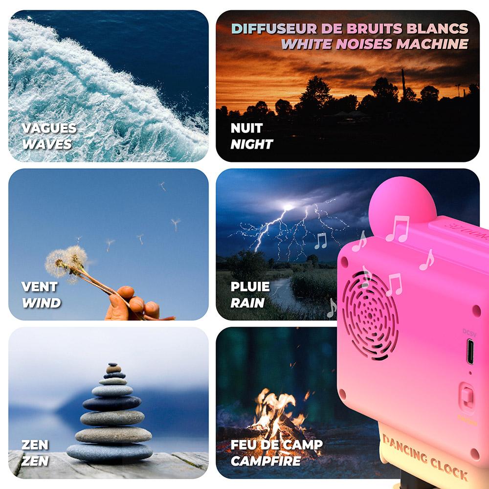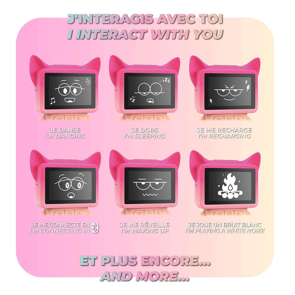 Встроенный динамик воспроизводит любимые треки, белый шум или природные звуки. Сменные силиконовые ушки (лиса или панда), анимации на LCD-дисплее, быстрая зарядка через USB-C и продолжительная автономность — стильный и весёлый старт утра.