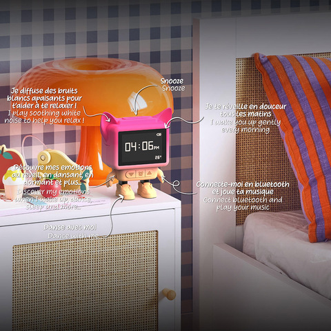 Этот яркий гаджет от Mob Paris — настоящее мини-шоу: будильник-часы-колонка с динамичным дизайном, который оживает при звуке музыки или сигнала.