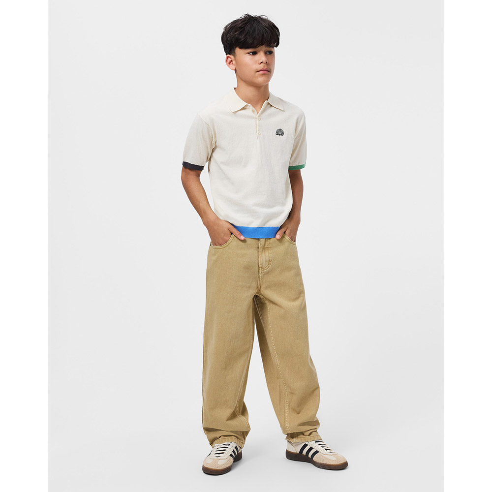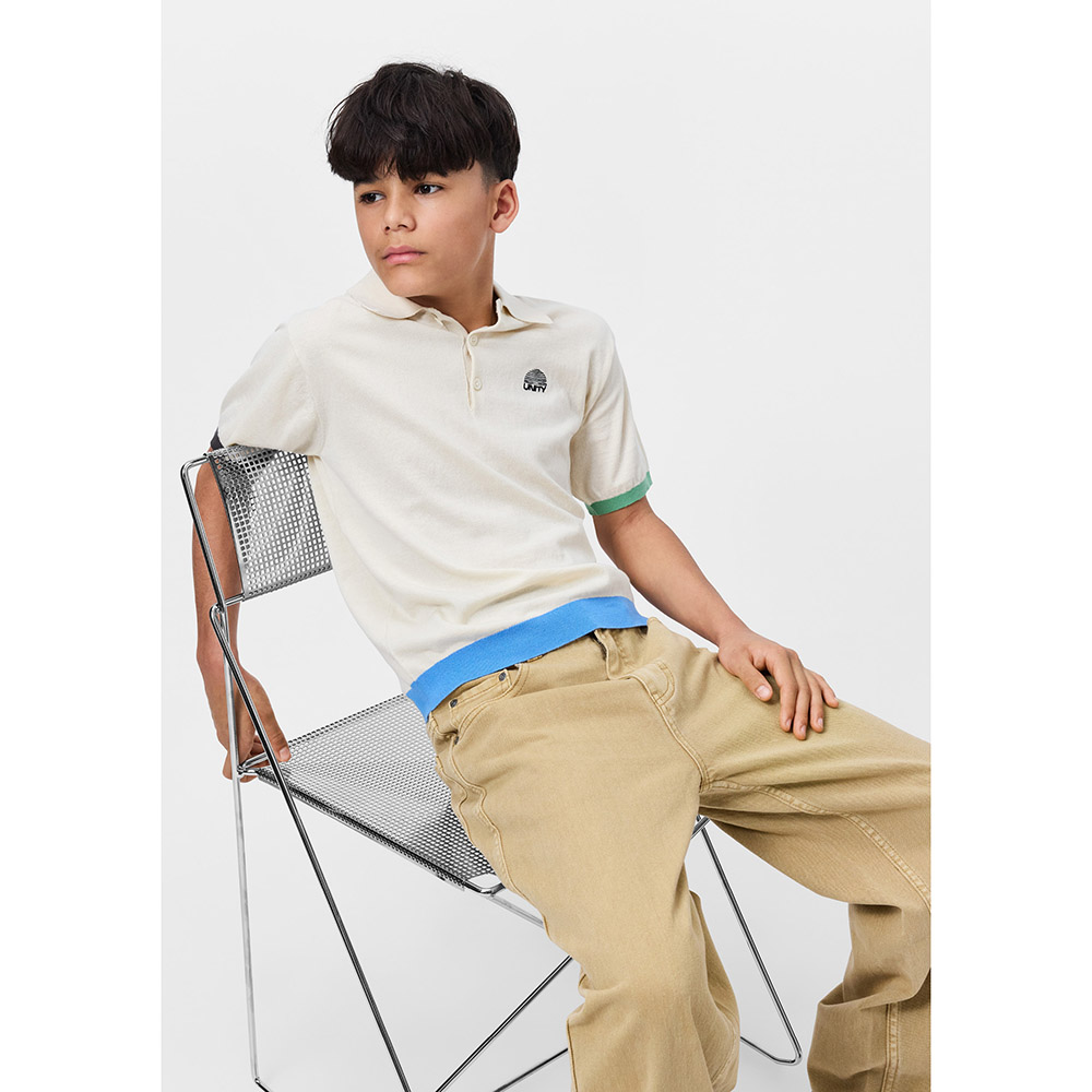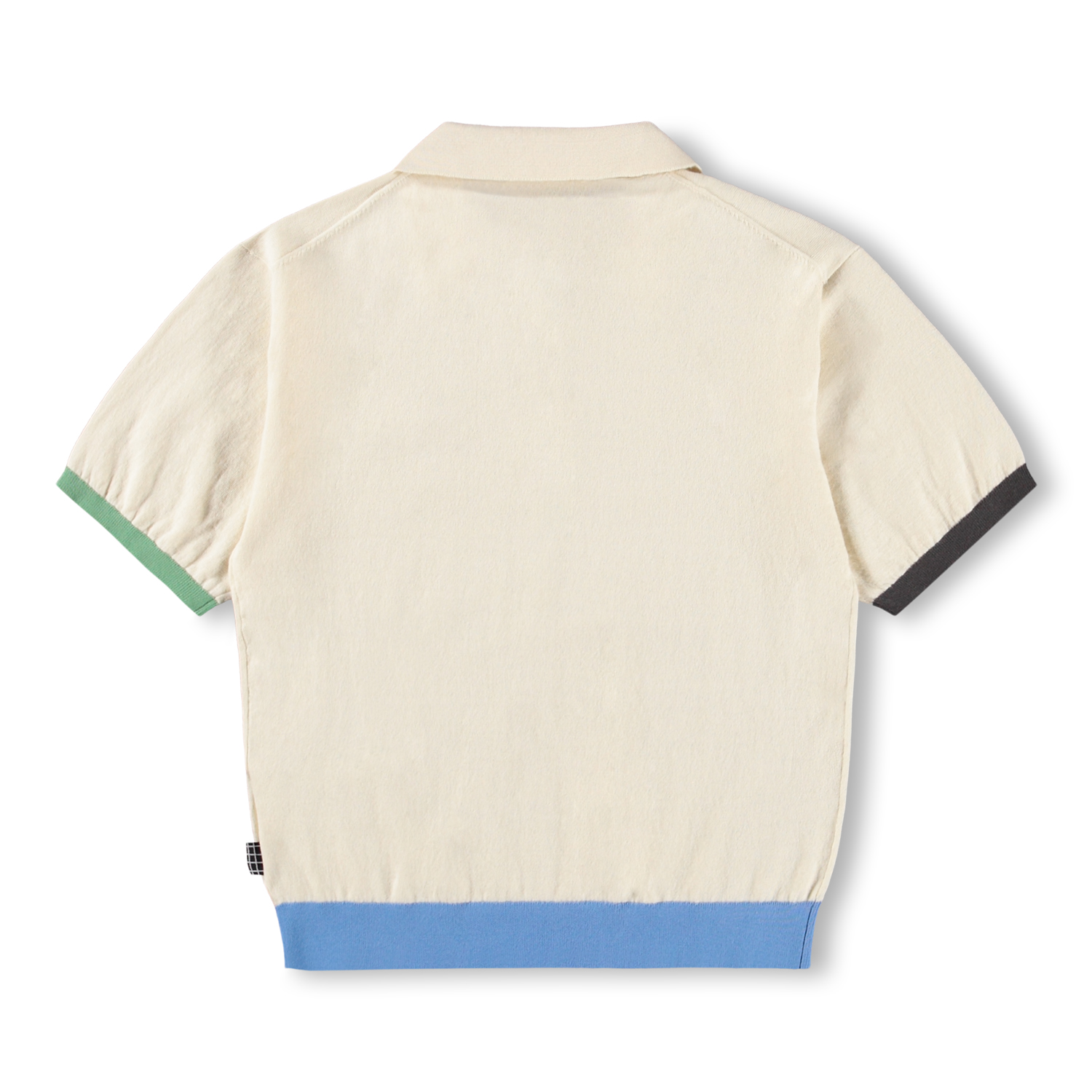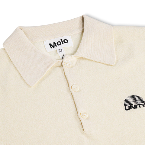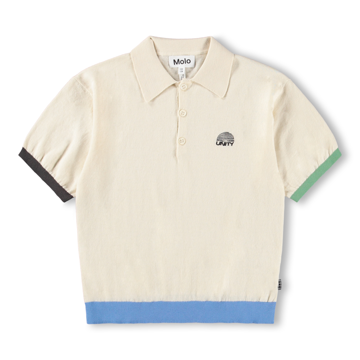 Нежное поло Molo в молочном цвете с контрастными полосками слегка в спортивном стиле. Воротник, пуговки на груди, короткие рукава.