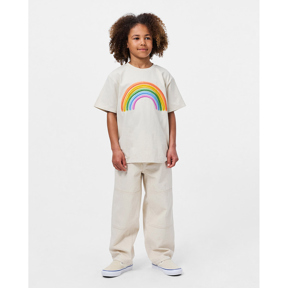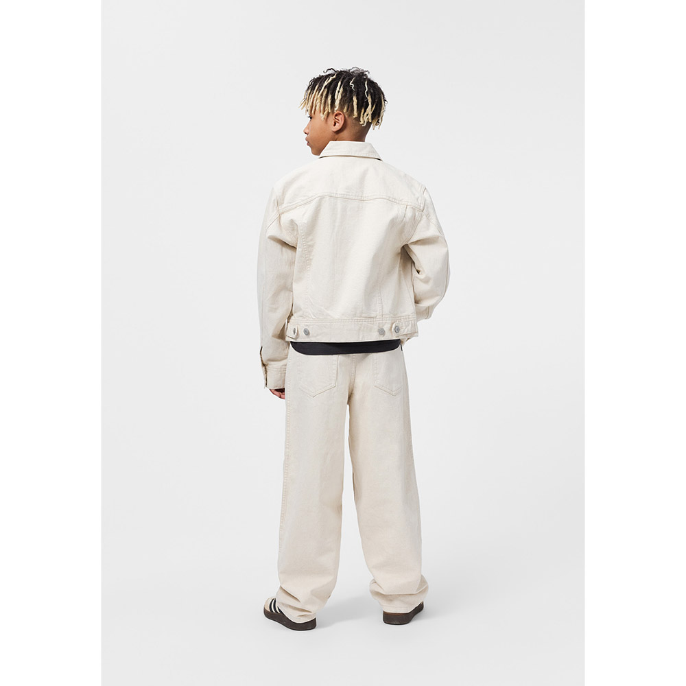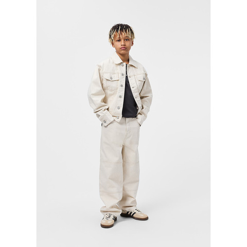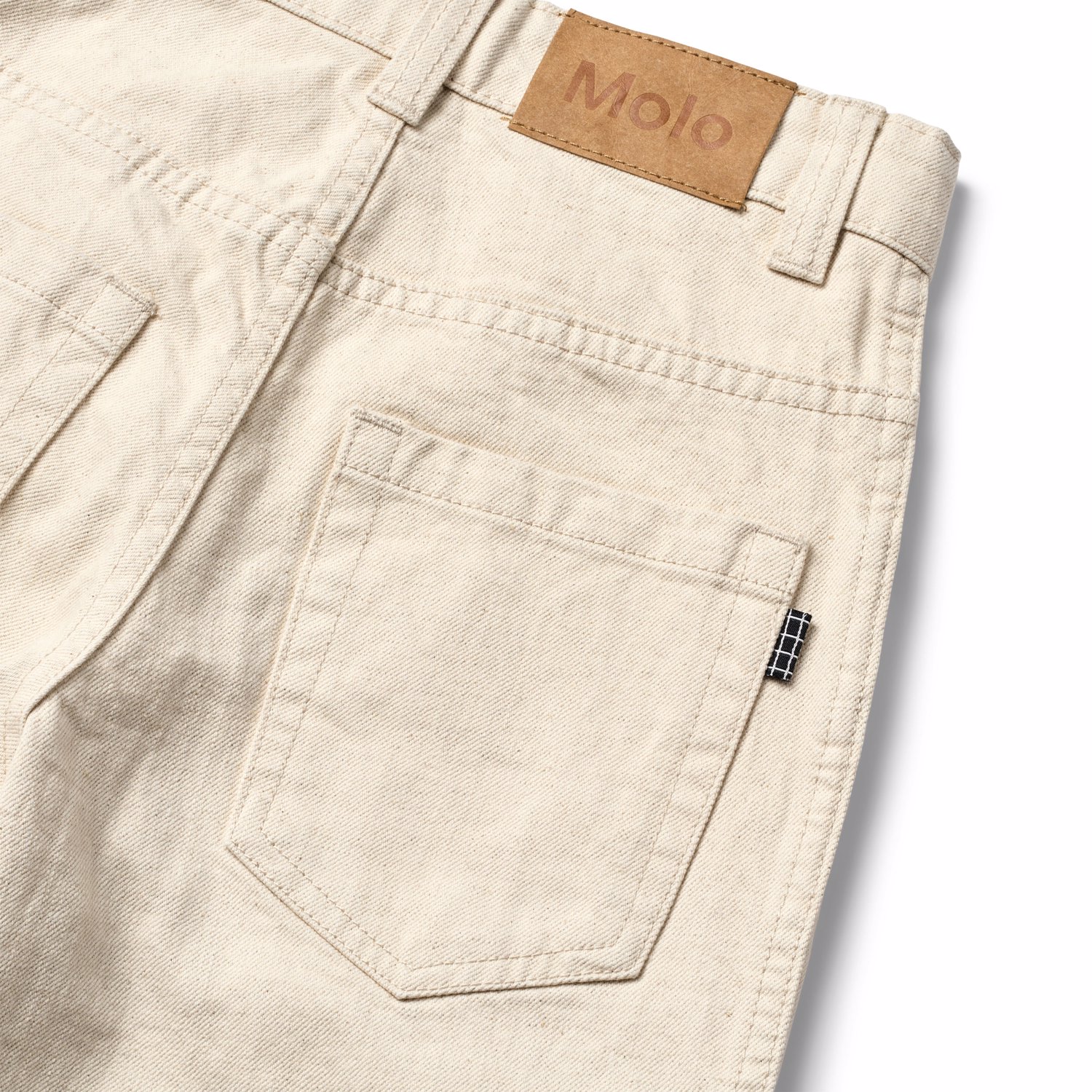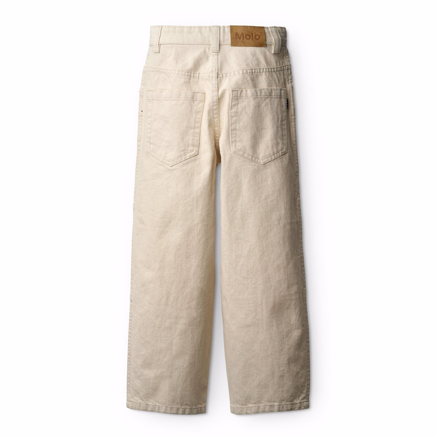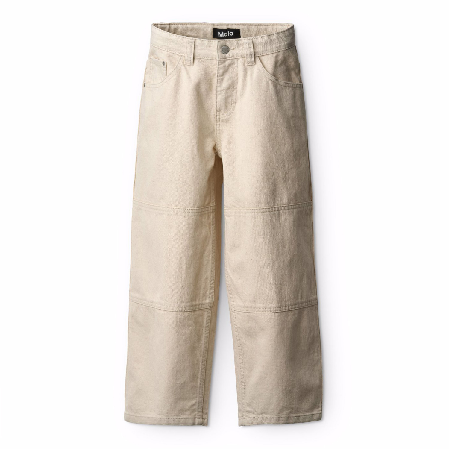 Хлопковые джинсы Molo в светлом бежевом цвете, модель оверсайз. Свободный фасон, пояс с петлями для ремня, внутри есть резинка, чтобы отрегулировать объем по талии. Подходят и мальчикам, и девочкам. Если вы любите более классическую посадку, рекомендуем выбирать размер меньше, чем обычно.