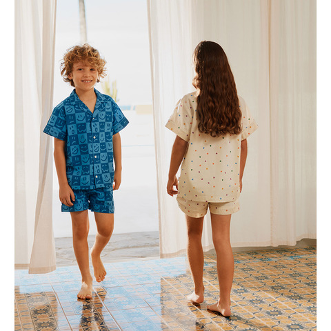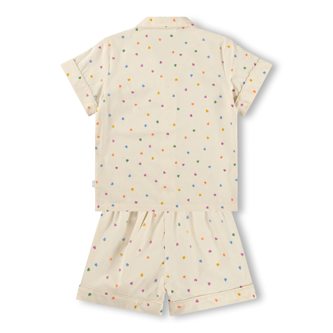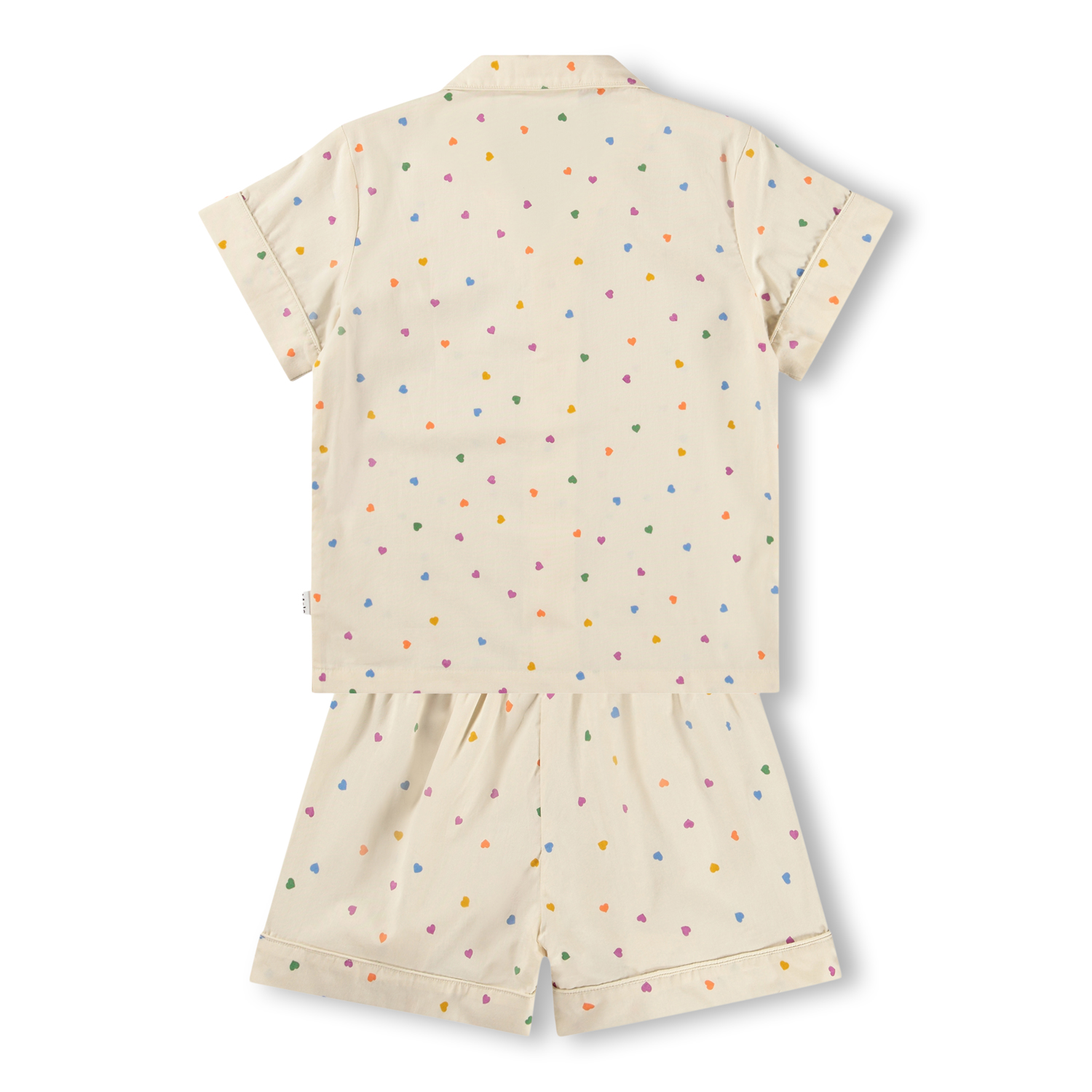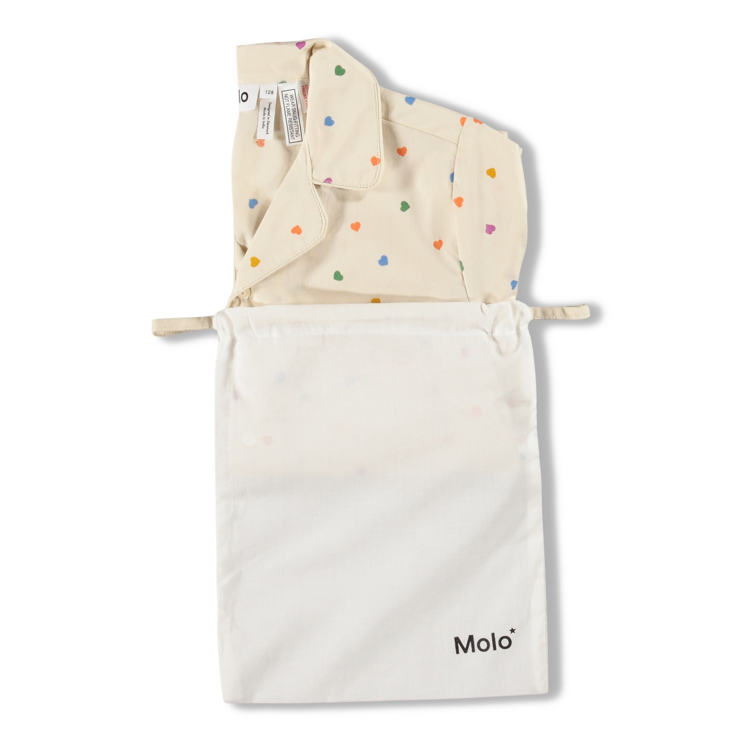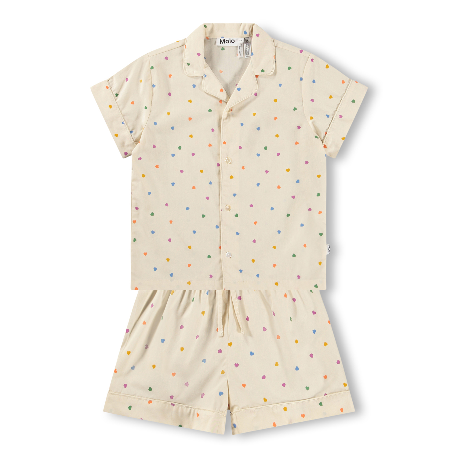 Роскошная пижама MOLO с разноцветными сердечками в летнем варианте с шортиками и рубашечкой с короткими рукавами. Шортики на резинке со шнурком на поясе, верх на пуговках. Пижама идет в хлопковом мешочке.
