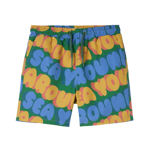 Купальные шорты Stella McCartney Kids с графичным текстовым принтом. Внутренние трусики, пояс на резинке и завязочках. Средняя длина. Максимальная защита от ультрафиолета UPF 50+.