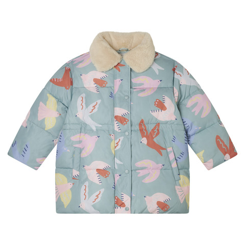 Утепленная, удлиненная куртка Stella McCartney Kids в серо-бирюзовом цвете с голубями и меховым воротничком. Застегивается на молнию и кнопки. Боковые карманы. Кулиска на поясе. Можно носить и осенью от +10, и зимой до -10-15С.