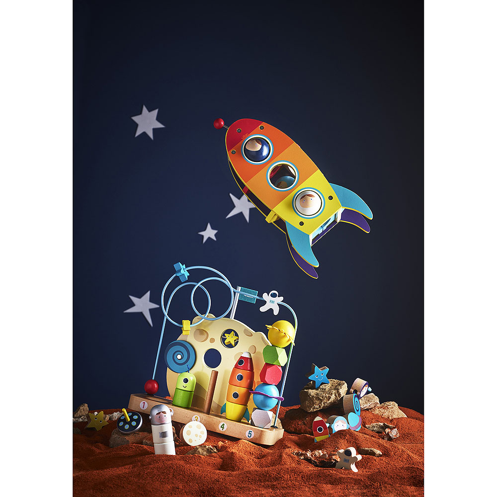Деревянный развивающий центр Vilac «К звёздам» — это многофункциональная игрушка для раннего развития малышей. На гранях куба ребёнка ждут лабиринты с бусинами, шестерёнки, сортер с фигурками, подвижные элементы и забавные иллюстрации на космическую тему. Игрушка помогает тренировать мелкую моторику, координацию движений, логическое мышление, внимание и усидчивость. Яркие, но не кричащие цвета и приятные на ощупь деревянные детали стимулируют тактильные ощущения и воображение. Все элементы выполнены из качественного дерева с безопасными красками. Игрушка подходит для игры дома и в детской комнате, станет красивым и полезным подарком для ребёнка.
