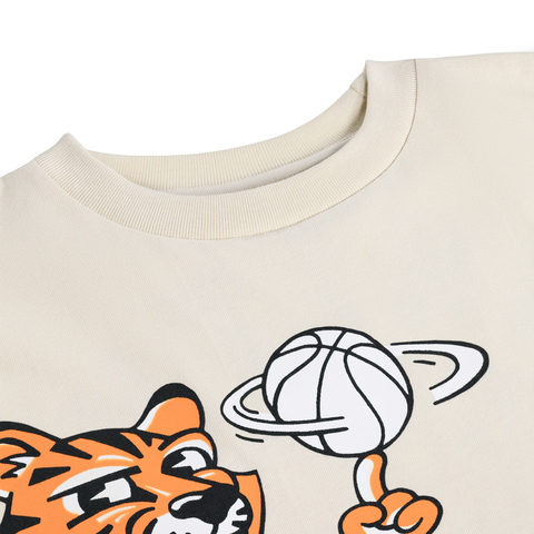 Хлопковая футболка MOLO с тигром-баскетболистом, вороном в кроссовках и мячом на спине. Свободный фасон и универсальный молочный цвет.